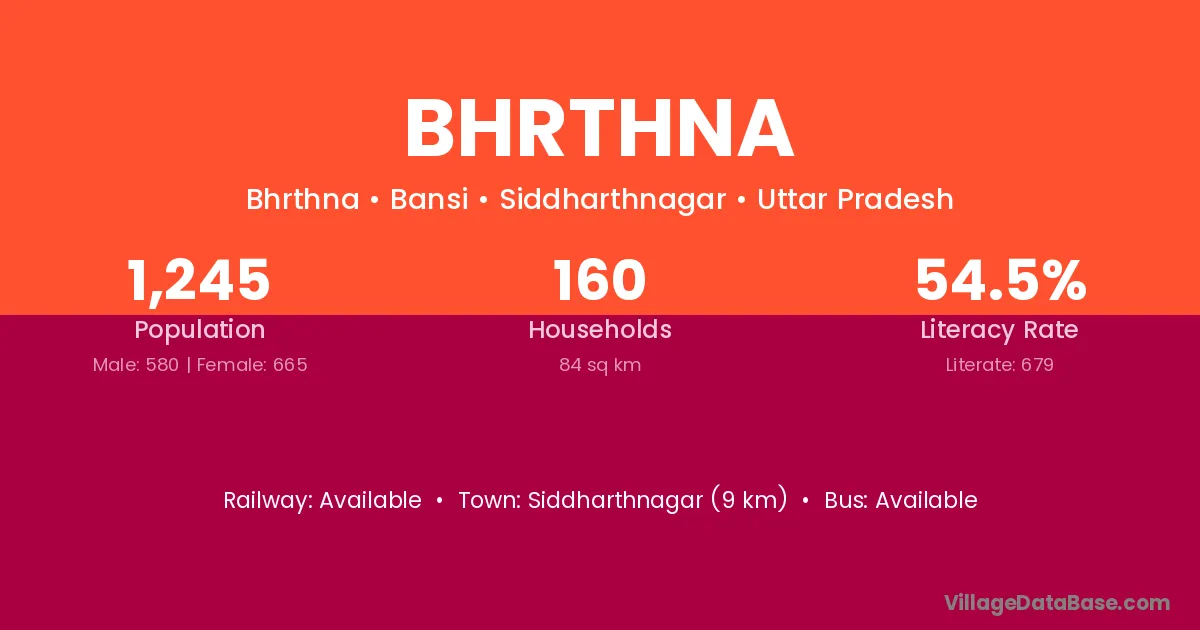 Siddharthnagar (9 km) is the nearest town to Bhrthna village for major economic activities and is located approximately 9 km away.