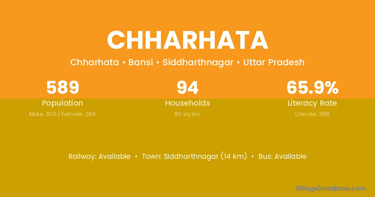 Siddharthnagar (14 km) is the nearest town to Chharhata village for major economic activities and is located approximately 14 km away.