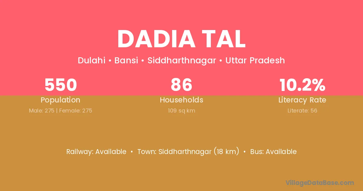 Siddharthnagar (18 km) is the nearest town to Dadia Tal village for major economic activities and is located approximately 18 km away.