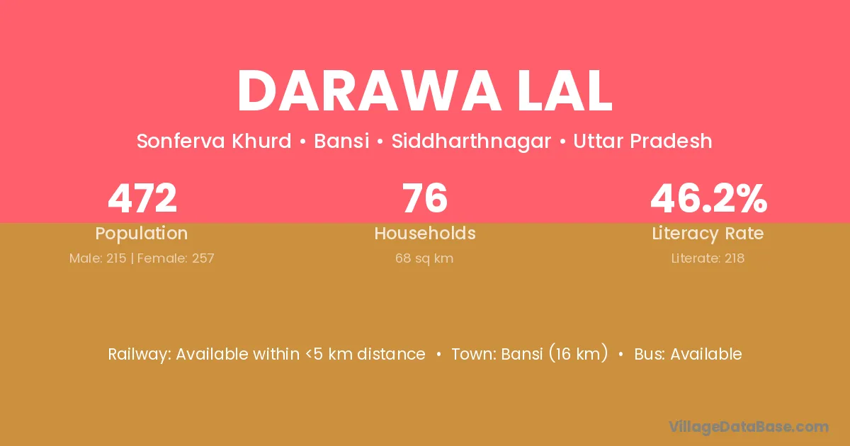 Bansi (16 km) is the nearest town to Darawa Lal village for major economic activities and is located approximately 16 km away.