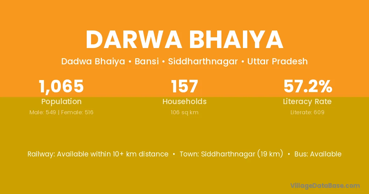 Siddharthnagar (19 km) is the nearest town to Darwa Bhaiya village for major economic activities and is located approximately 19 km away.