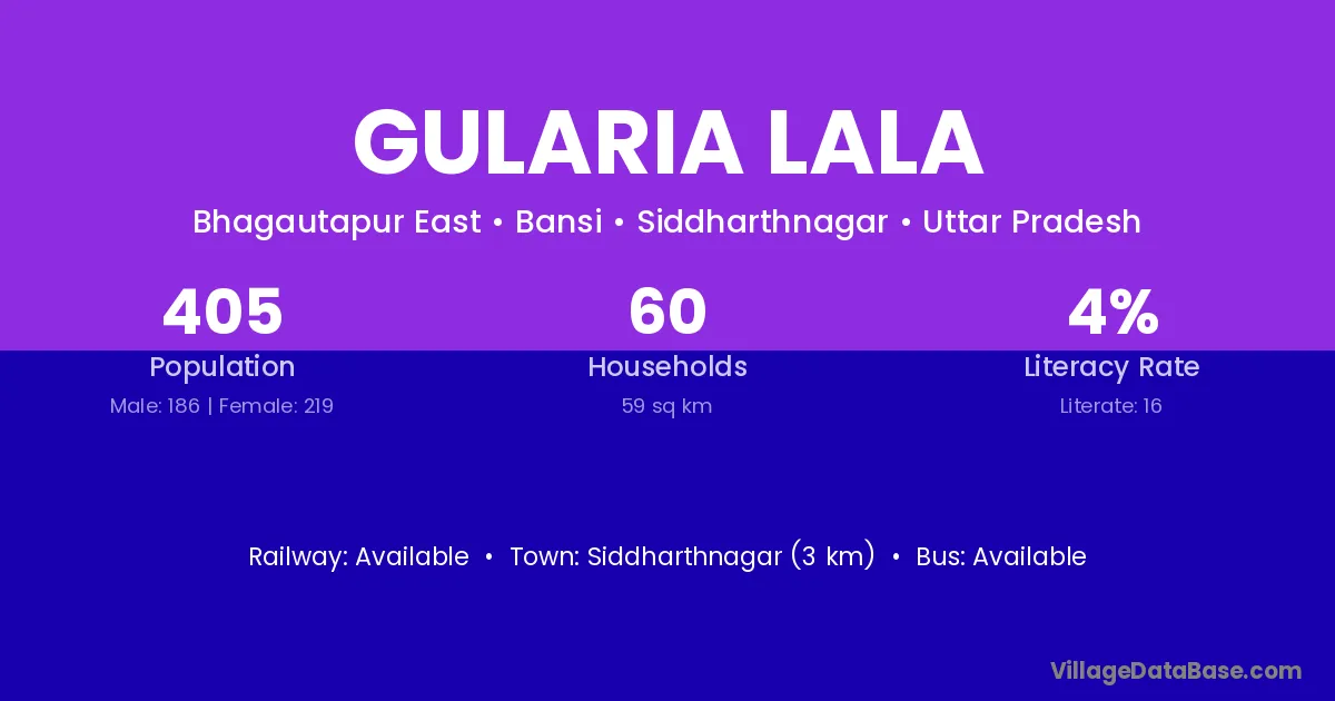 Siddharthnagar (3 km) is the nearest town to Gularia Lala village for major economic activities and is located approximately 3 km away.