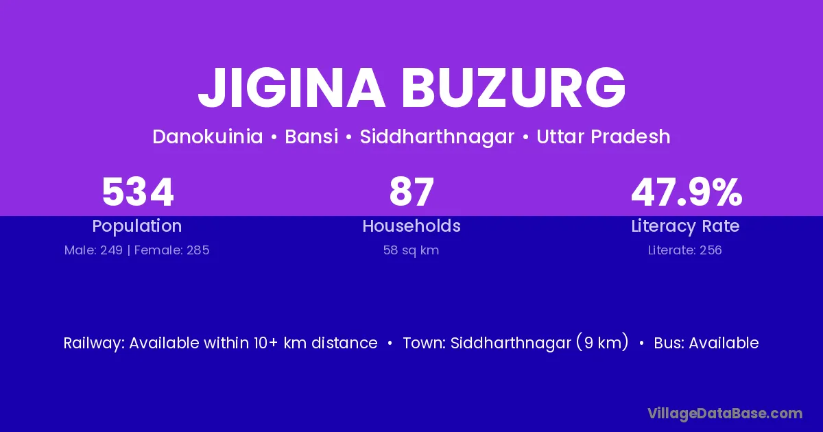 Siddharthnagar (9 km) is the nearest town to Jigina Buzurg village for major economic activities and is located approximately 9 km away.