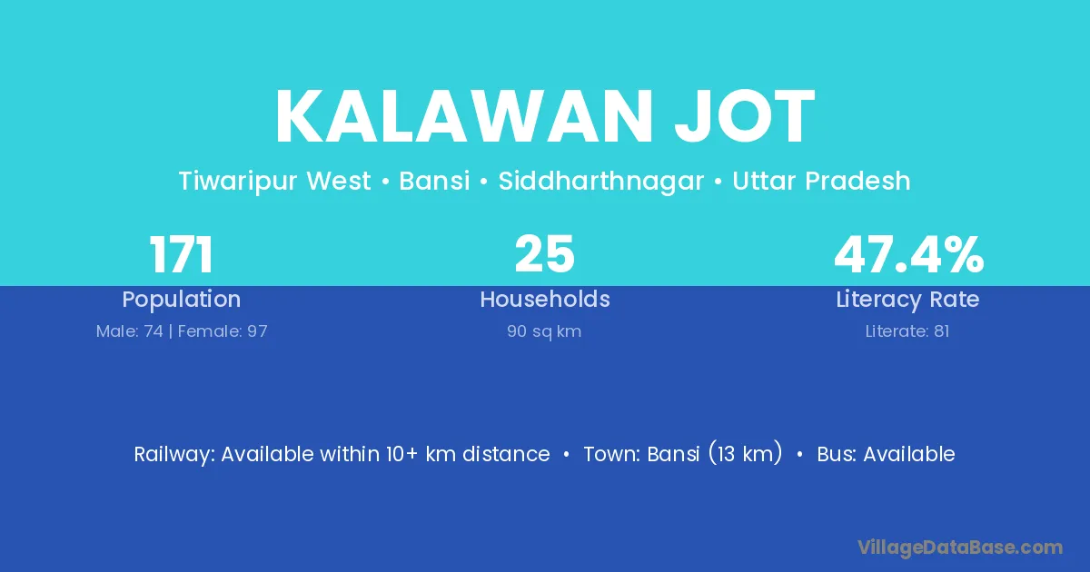 Bansi (13 km) is the nearest town to Kalawan Jot village for major economic activities and is located approximately 13 km away.