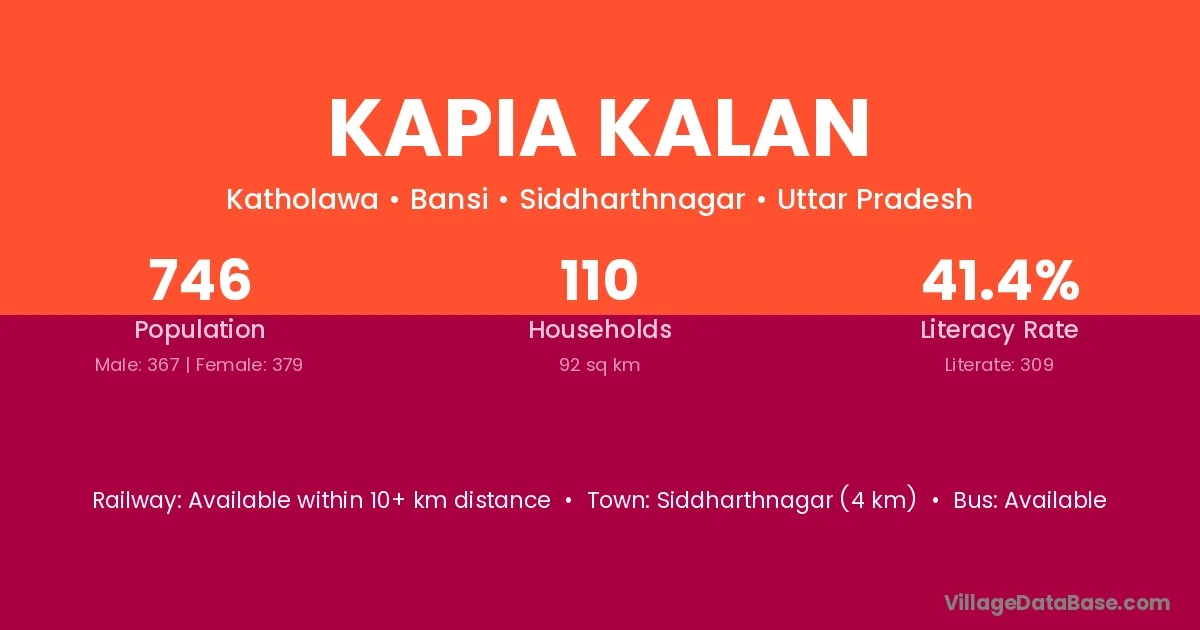 Kapia Kalan village has a total population of 746 people, of which 367 are males and 379 are females.