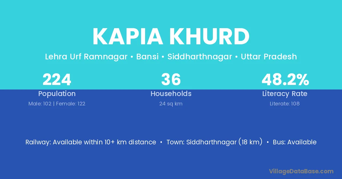 Siddharthnagar (18 km) is the nearest town to Kapia Khurd village for major economic activities and is located approximately 18 km away.