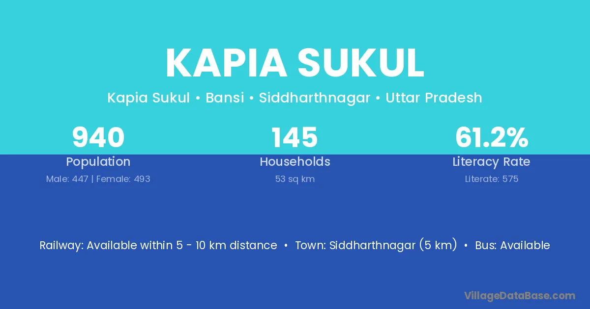 Siddharthnagar (5 km) is the nearest town to Kapia Sukul village for major economic activities and is located approximately 5 km away.