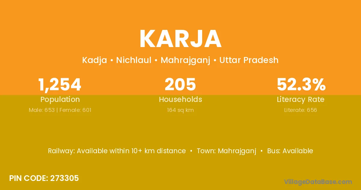 Siddharthnagar (15 km) is the nearest town to Karja village for major economic activities and is located approximately 15 km away.