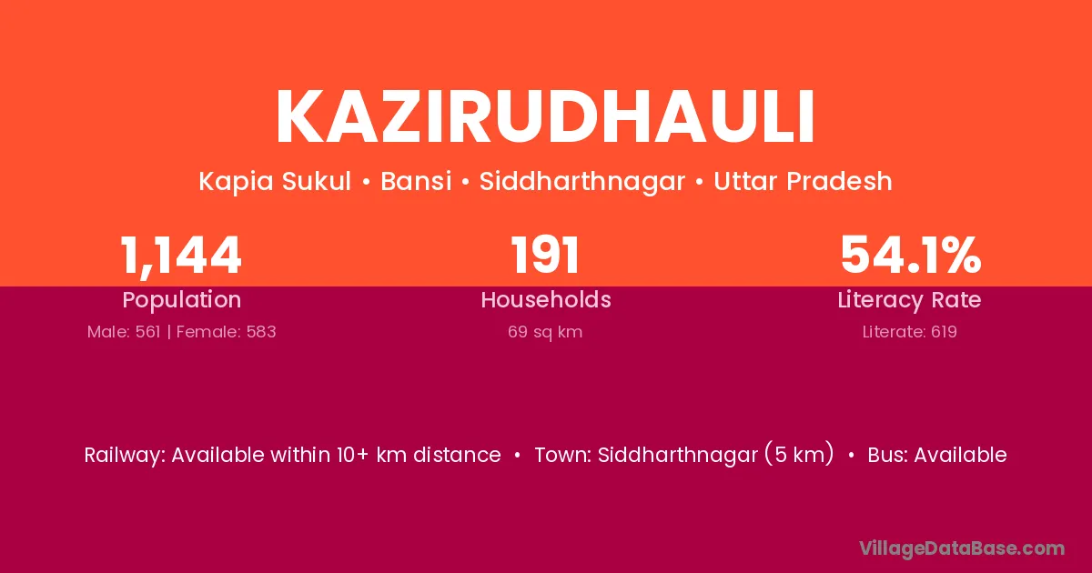 Siddharthnagar (5 km) is the nearest town to Kazirudhauli village for major economic activities and is located approximately 5 km away.