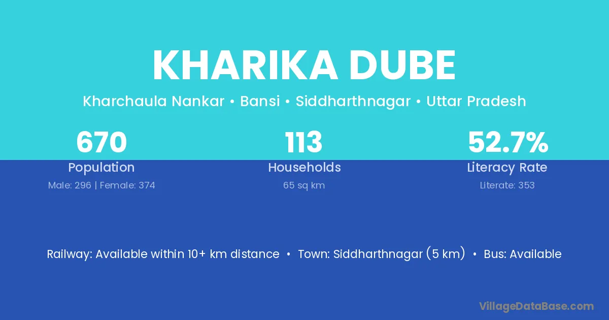 Siddharthnagar (5 km) is the nearest town to Kharika Dube village for major economic activities and is located approximately 5 km away.