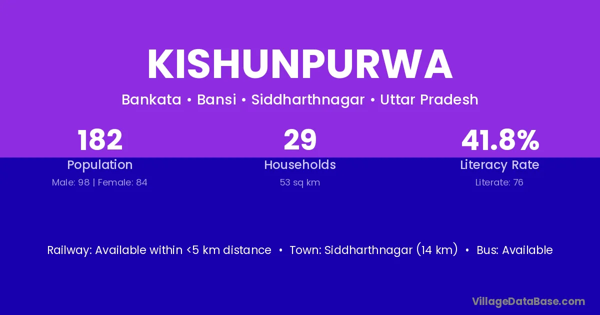 Kishunpurwa village has a total population of 182 people, of which 98 are males and 84 are females.