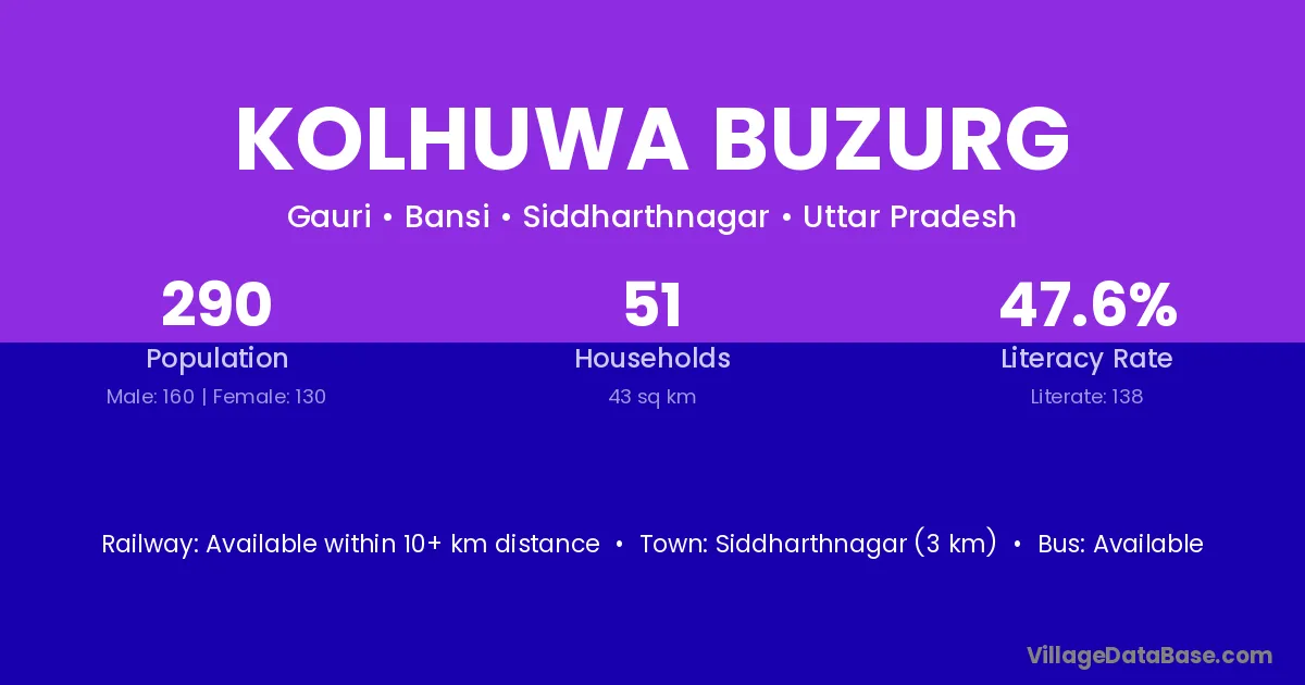 Siddharthnagar (3 km) is the nearest town to Kolhuwa Buzurg village for major economic activities and is located approximately 3 km away.
