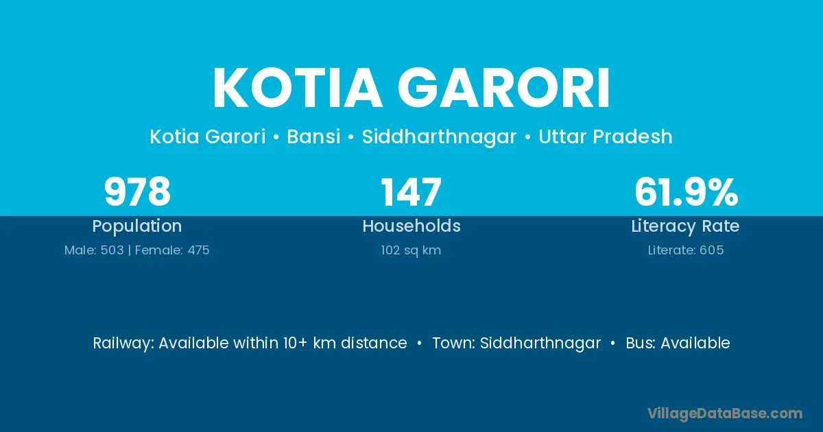 Kotia Garori village has a total population of 978 people, of which 503 are males and 475 are females.