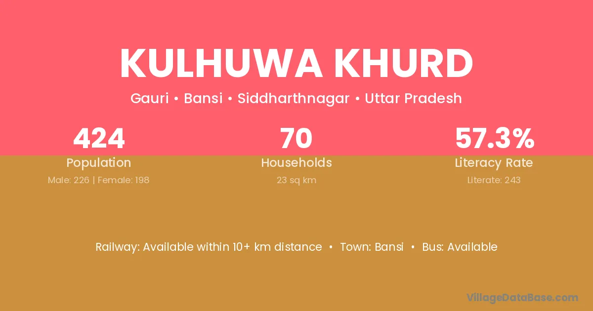 Kulhuwa Khurd village has a total population of 424 people, of which 226 are males and 198 are females.