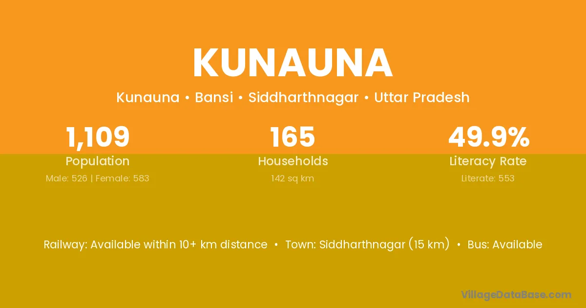 Siddharthnagar (15 km) is the nearest town to Kunauna village for major economic activities and is located approximately 15 km away.