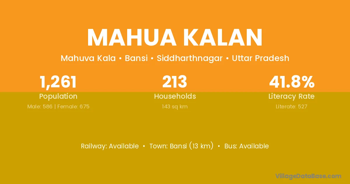 Bansi (13 km) is the nearest town to Mahua Kalan village for major economic activities and is located approximately 13 km away.