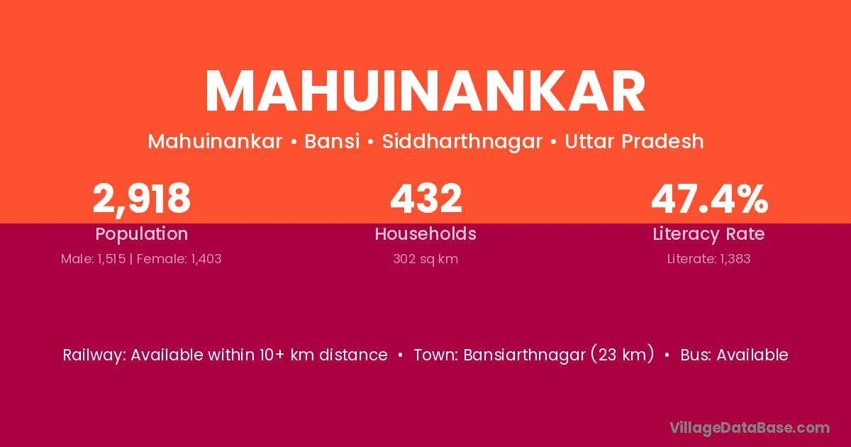 Bansiarthnagar (23 km) is the nearest town to Mahuinankar village for major economic activities and is located approximately 23 km away.