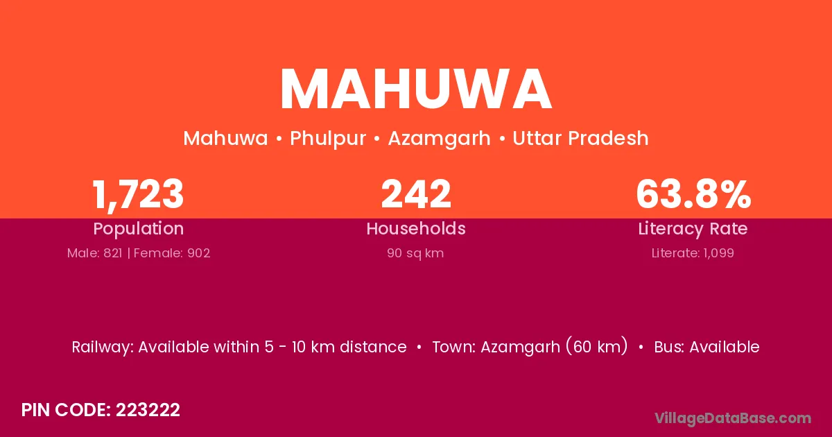 The literacy rate of Mahuwa village is 62.73%. Male literacy stands at 70.04% and female literacy at 55.41%.