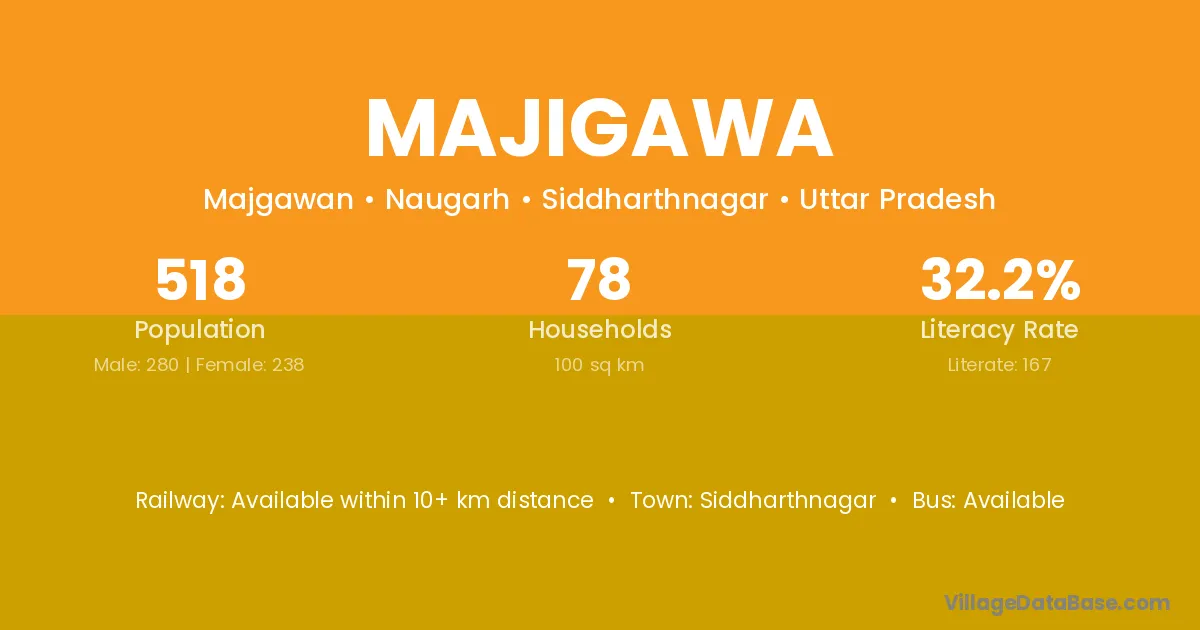 Siddharthnagar (14 km) is the nearest town to Majigawa village for major economic activities and is located approximately 14 km away.