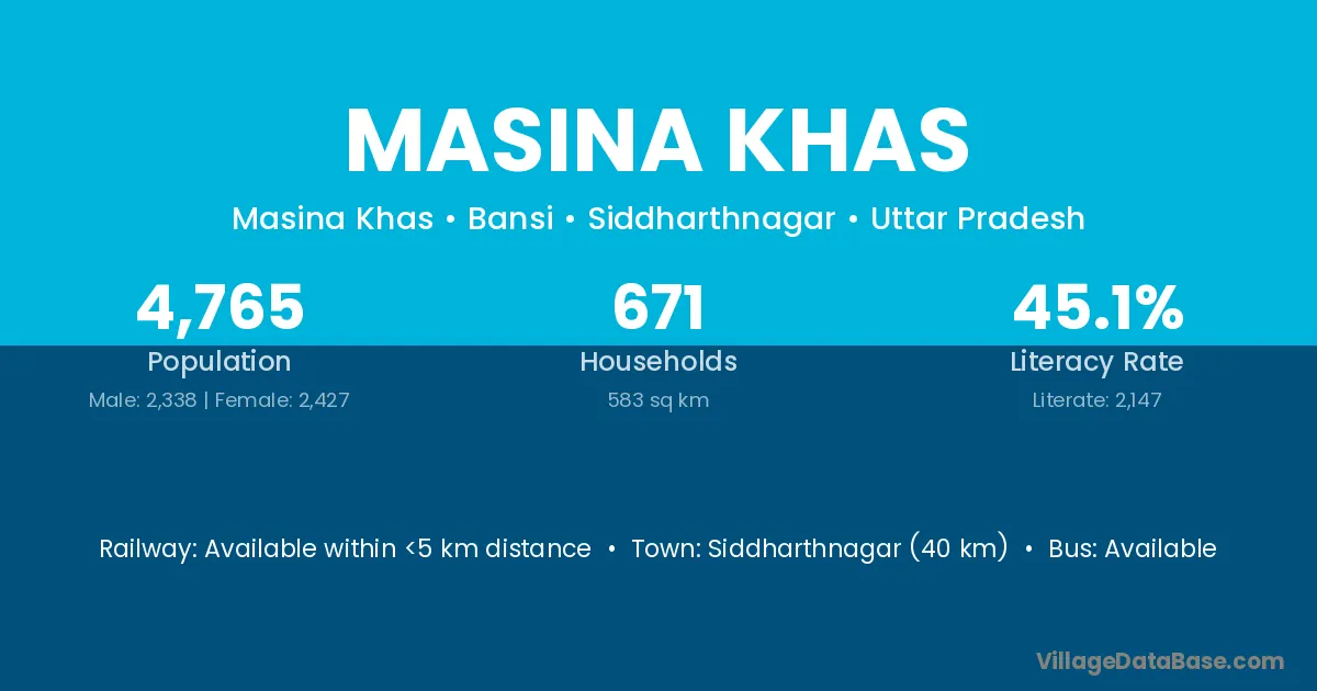 Siddharthnagar (40 km) is the nearest town to Masina Khas village for major economic activities and is located approximately 40 km away.