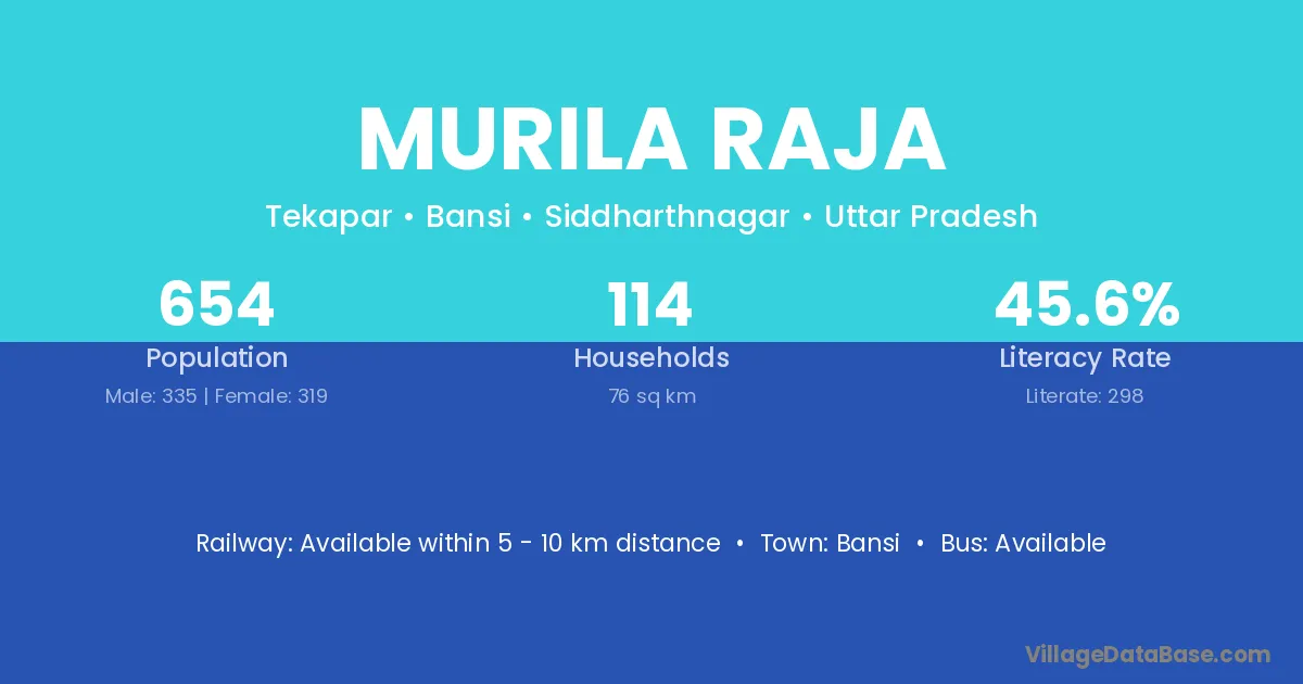 Murila Raja village has a total population of 654 people, of which 335 are males and 319 are females.