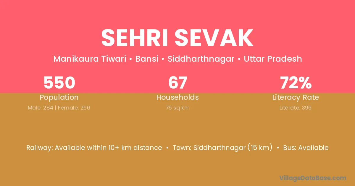Siddharthnagar (15 km) is the nearest town to Sehri Sevak village for major economic activities and is located approximately 15 km away.