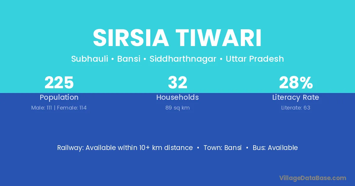 Sirsia Tiwari village has a total population of 225 people, of which 111 are males and 114 are females.