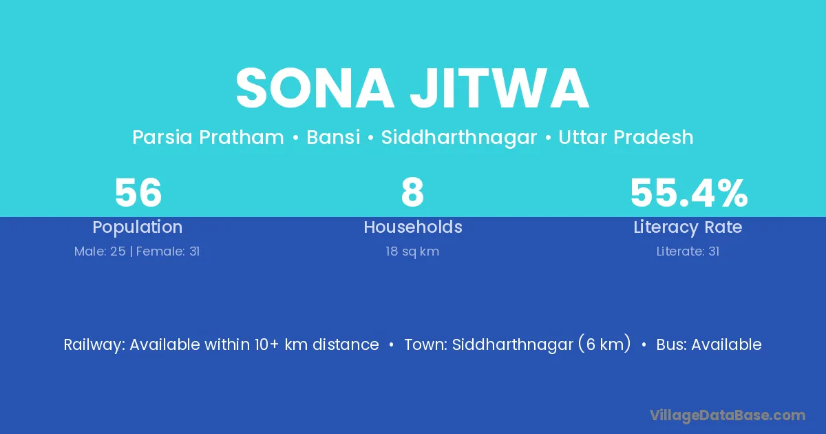 Siddharthnagar (6 km) is the nearest town to Sona Jitwa village for major economic activities and is located approximately 6 km away.
