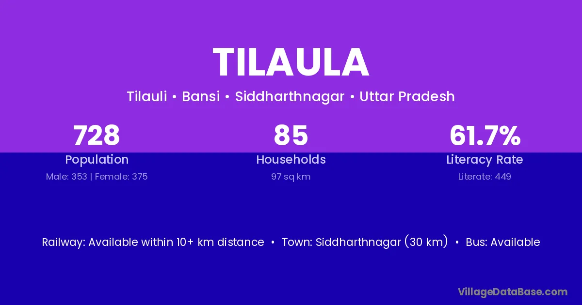 Siddharthnagar (30 km) is the nearest town to Tilaula village for major economic activities and is located approximately 30 km away.