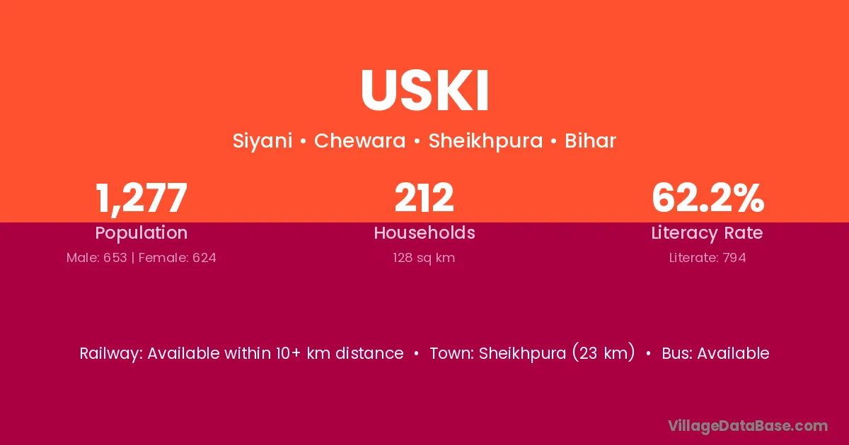 Uski village has a total population of 230 people, of which 117 are males and 113 are females.