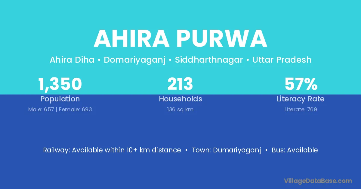 Ahira Purwa village has a total population of 1,350 people, of which 657 are males and 693 are females.
