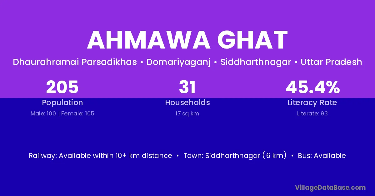 Ahmawa Ghat village has a total population of 205 people, of which 100 are males and 105 are females.