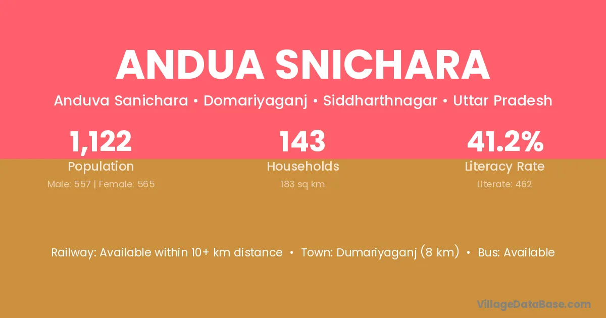 Dumariyaganj (8 km) is the nearest town to Andua Snichara village for major economic activities and is located approximately 8 km away.
