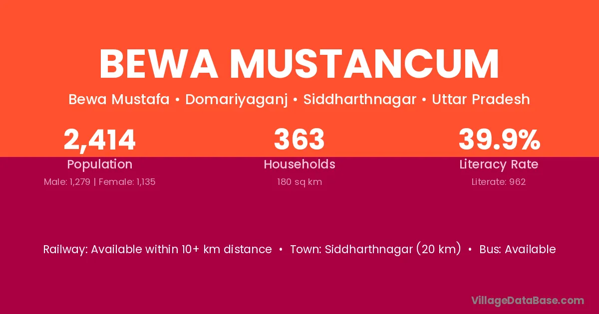 Siddharthnagar (20 km) is the nearest town to Bewa Mustancum village for major economic activities and is located approximately 20 km away.