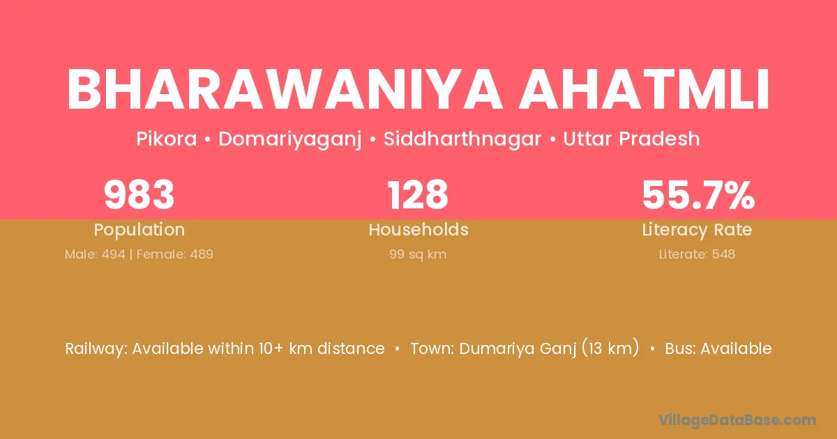 Dumariya Ganj (13 km) is the nearest town to Bharawaniya Ahatmli village for major economic activities and is located approximately 13 km away.