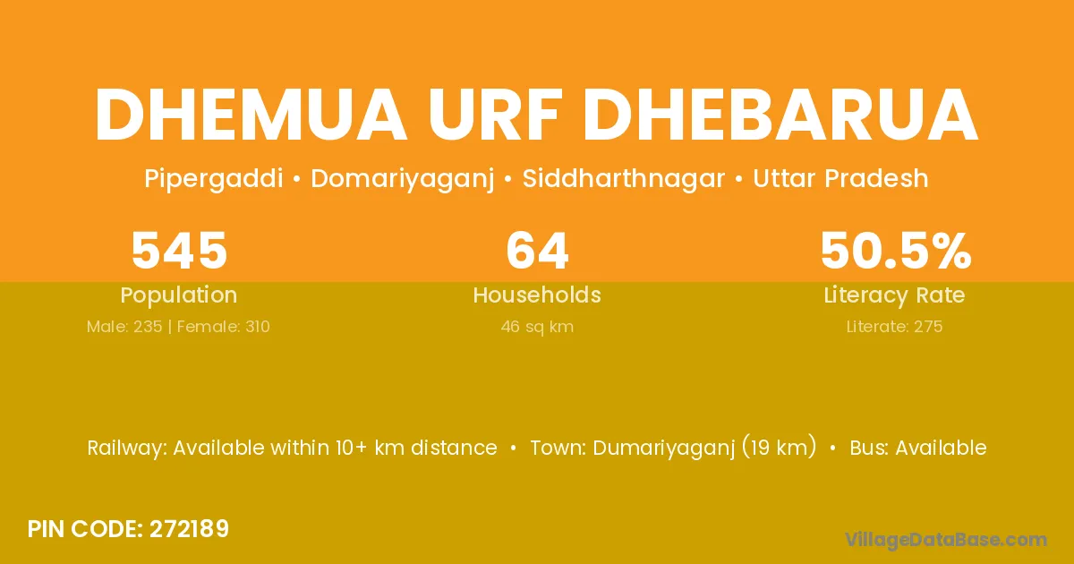 Dhemua Urf Dhebarua village has a total population of 545 people, of which 235 are males and 310 are females.