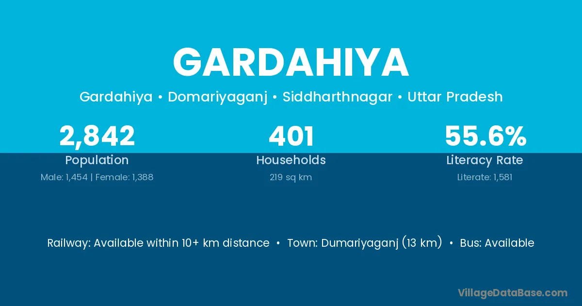 Dumariyaganj (13 km) is the nearest town to Gardahiya village for major economic activities and is located approximately 13 km away.