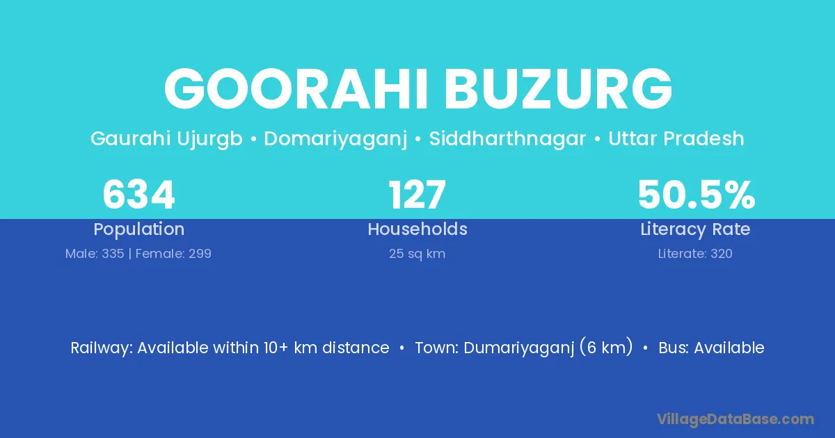 Dumariyaganj (6 km) is the nearest town to Goorahi Buzurg village for major economic activities and is located approximately 6 km away.