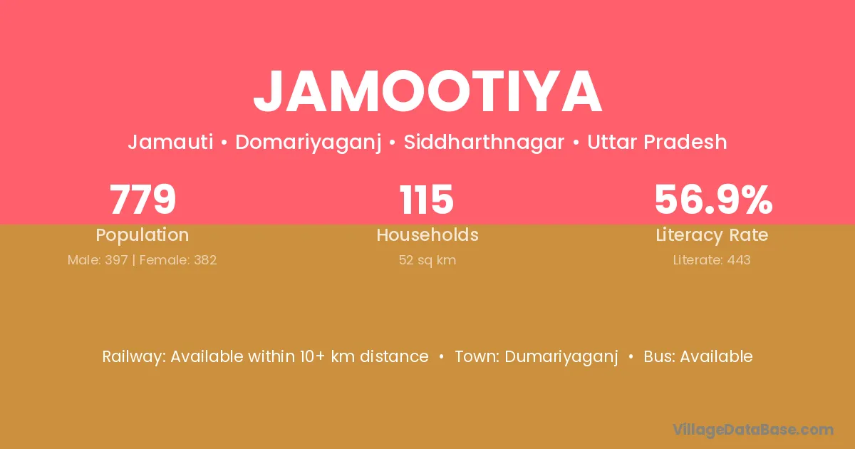 Jamootiya village has a total population of 779 people, of which 397 are males and 382 are females.