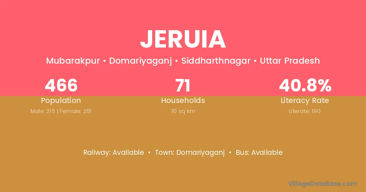 Jeruia village has a total population of 466 people, of which 215 are males and 251 are females.