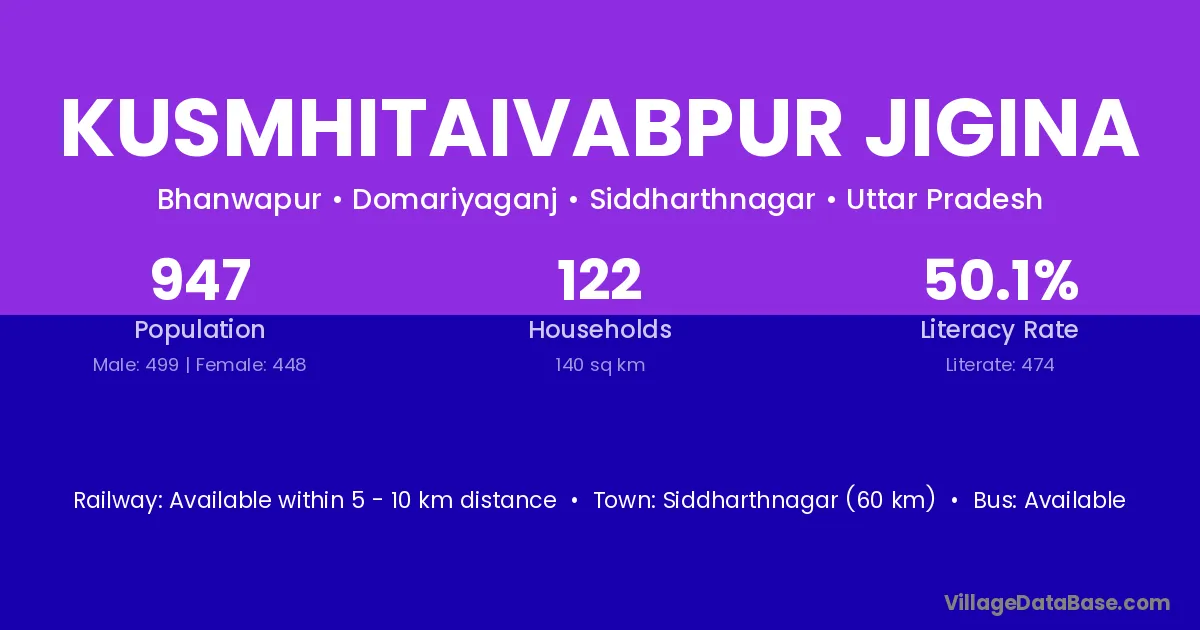 Kusmhitaivabpur Jigina village has a total population of 947 people, of which 499 are males and 448 are females.