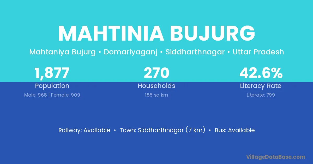 Siddharthnagar (7 km) is the nearest town to Mahtinia Bujurg village for major economic activities and is located approximately 7 km away.