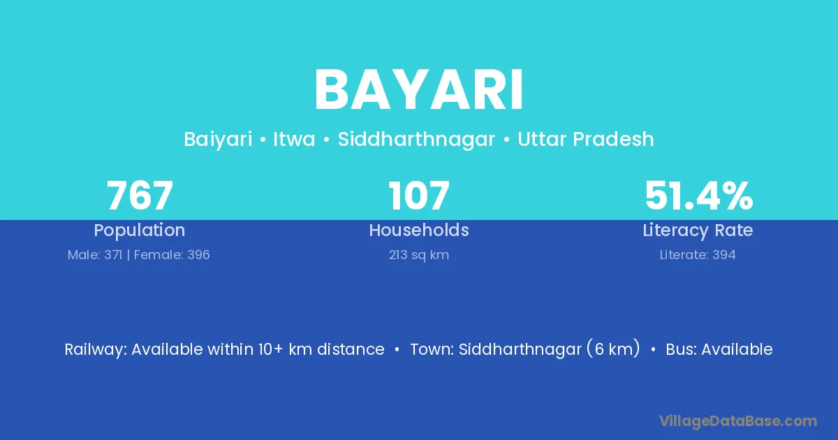 Siddharthnagar (6 km) is the nearest town to Bayari village for major economic activities and is located approximately 6 km away.