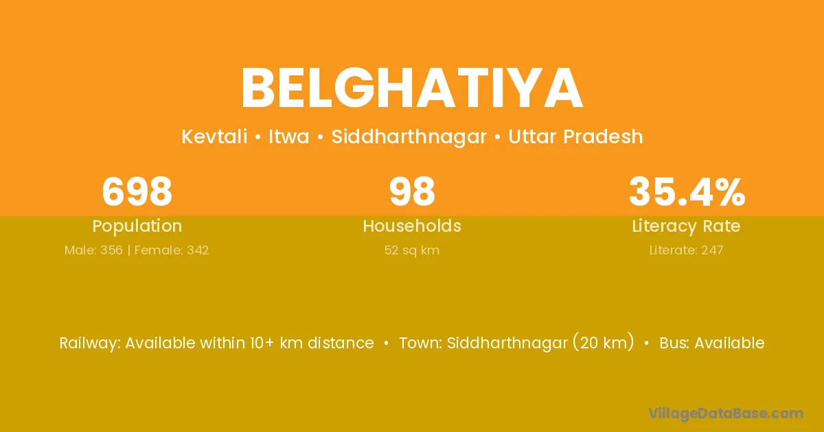Siddharthnagar (20 km) is the nearest town to Belghatiya village for major economic activities and is located approximately 20 km away.