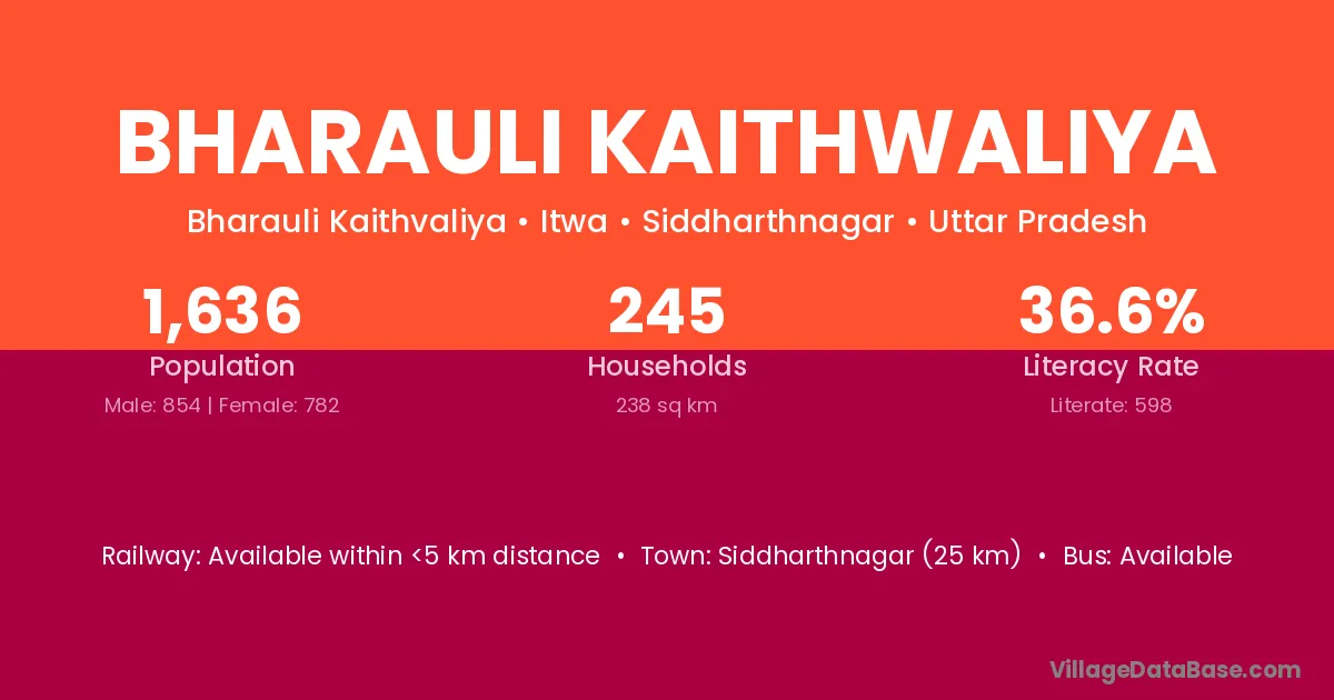 Siddharthnagar (25 km) is the nearest town to Bharauli Kaithwaliya village for major economic activities and is located approximately 25 km away.
