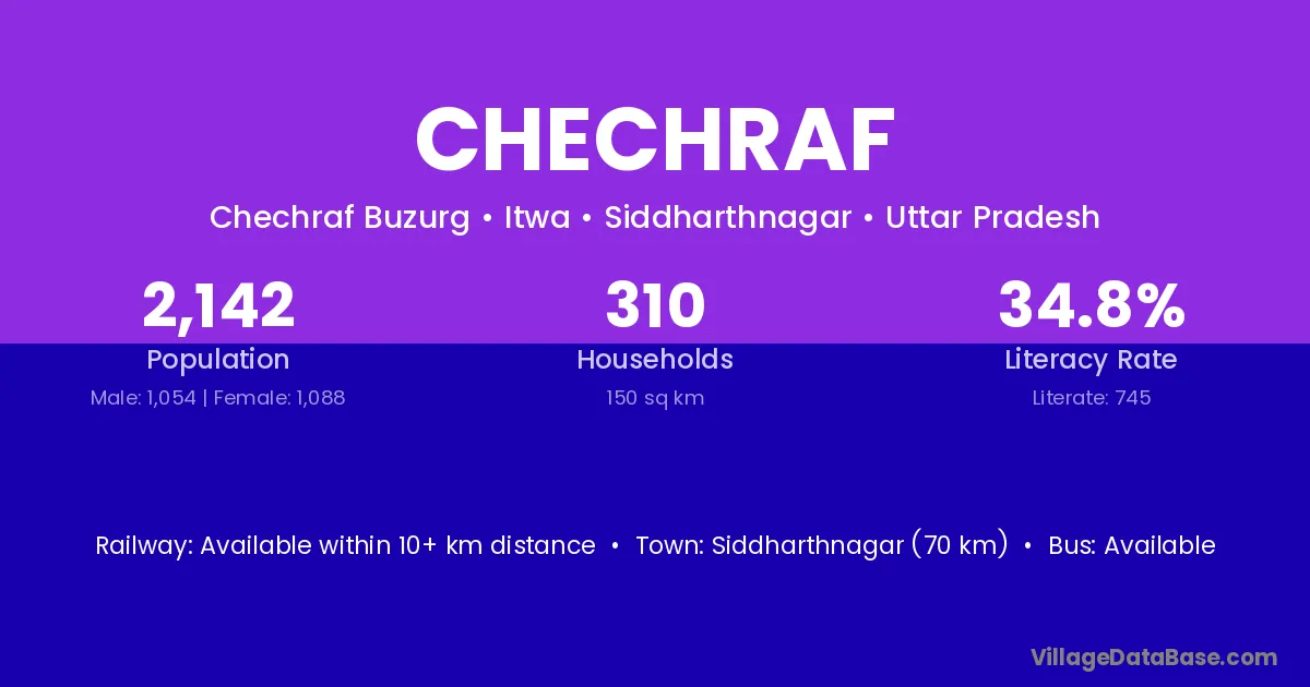 Siddharthnagar (70 km) is the nearest town to Chechraf village for major economic activities and is located approximately 70 km away.