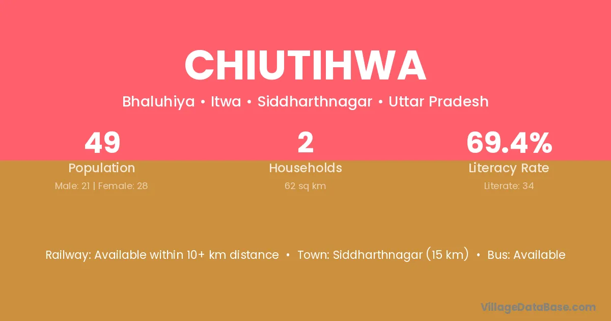 Siddharthnagar (15 km) is the nearest town to Chiutihwa village for major economic activities and is located approximately 15 km away.