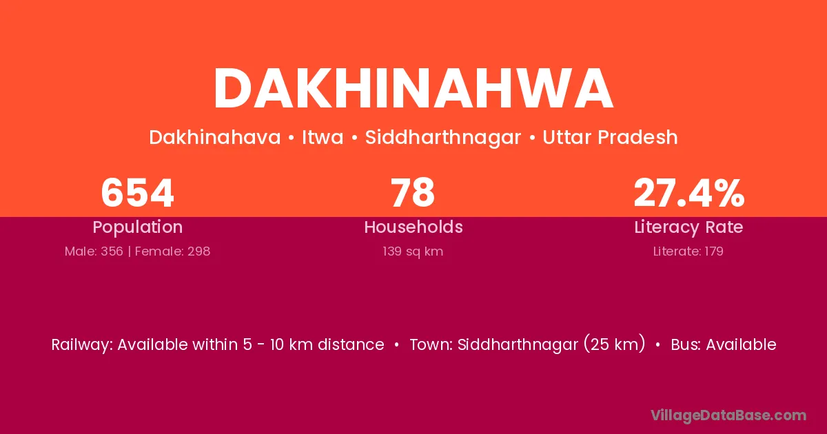 Siddharthnagar (25 km) is the nearest town to Dakhinahwa village for major economic activities and is located approximately 25 km away.