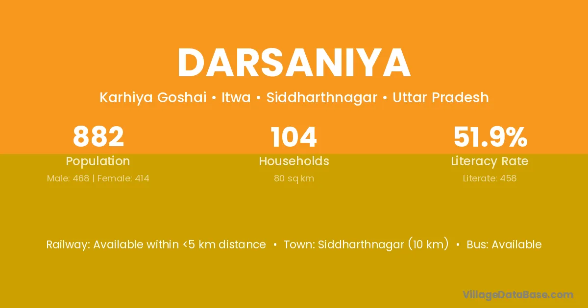 Siddharthnagar (10 km) is the nearest town to Darsaniya village for major economic activities and is located approximately 10 km away.