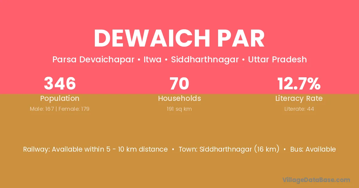 Siddharthnagar (16 km) is the nearest town to Dewaich Par village for major economic activities and is located approximately 16 km away.